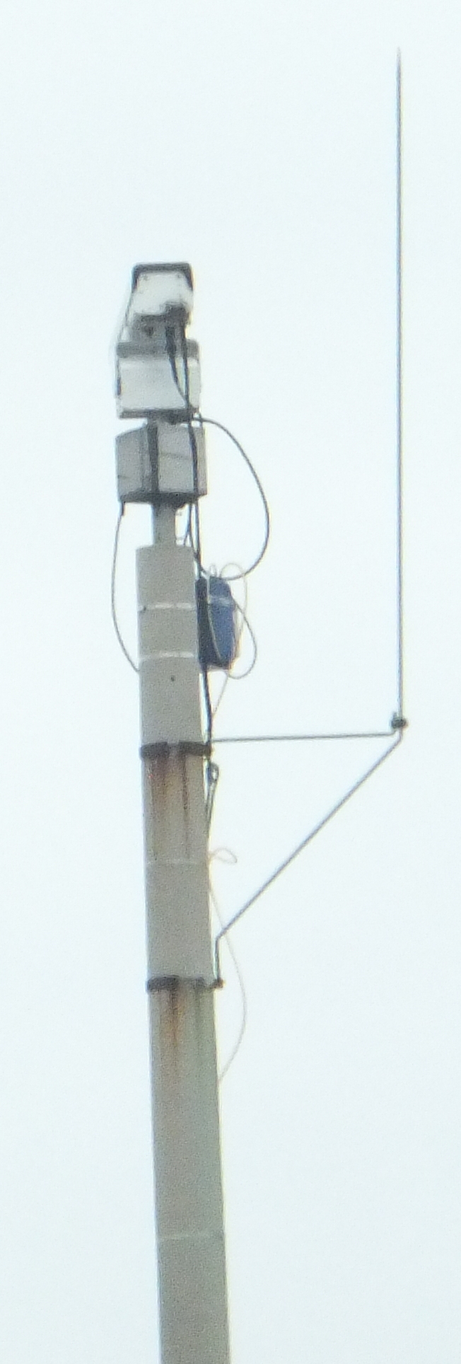 1-й тип камер на высоченных столбах: тип CCTV. Имеется одна, а то и две (направленные в противоположные стороны) камеры. По фотографиям видно, что с камеры посылается (с помощью антенны) дистанционный сигнал, т.е. куда-то передаётся изображение. Таким же образом камера управляется дистанционно. Также видно, что камера может поворачиваться в сторону интересующей спецслужбы цели (вид сзади):