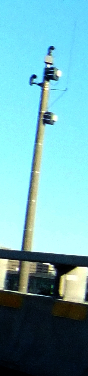 2-й тип камер на высоченных столбах: камеры инфракрасного видения, способные чётко передавать изображение при любых световых и погодных условиях, даже в полной темноте, а также снабжённые системой адаптации чёткости изображения к скорости движущегося объекта. Имеется одна, а то и две (направленные в противоположные стороны) камеры: