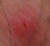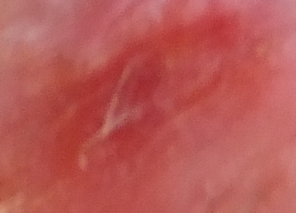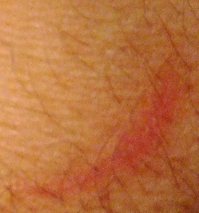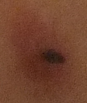 2 следующих примера: а) очагово-целлюлитное поражение кожи (крайне странное явление, потому что целлюлит не проявляет себя таким образом); б) "метка", временно остававшаяся после самостоятельного удаления (когда врачи отказали в этом) одного из воспалившихся наростов на коже; следы воспаления (а, значит, и показания к немедленному удалению) - на снимке всё ещё видны.
