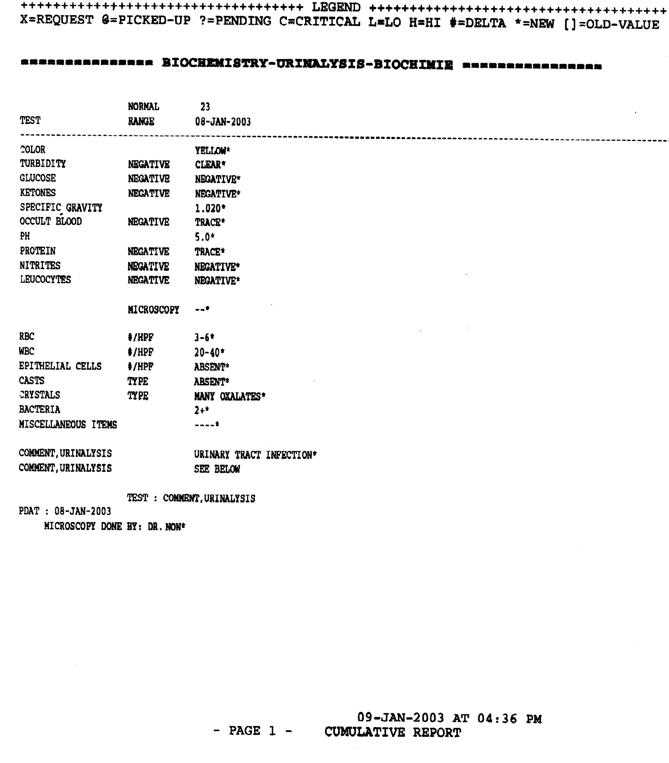 Я сам себе назначал (за деньги; клиник частных в Канаде нет, но есть частные лаборатории) проверку почек, обоих пузырей, путей, и т.д.: безрезультатно. Правда, пара анализов за все годы выявила инфекцию; только вот недостача: страница, где должно быть указано, какая именно это инфекция - пропала. Пропала не только в распечатке, но и в компьютере. В другом случае указано, что разъяснение об инфекции следует ниже, внизу той же страницы. Но там ничего нет. Досадно? Или нужен другой эпитет?