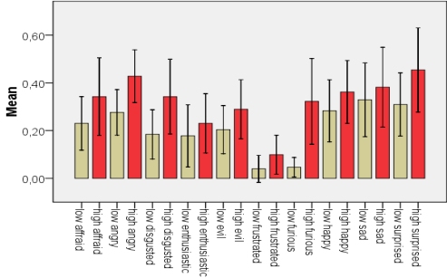 То же касается и намерений, а также долговременного прогноза намерений и поведения. На базе мимики составляется карта-схема соотношений монад (пары противоположностей) значений основных эмоций, и на её основе составляется прогноз.
